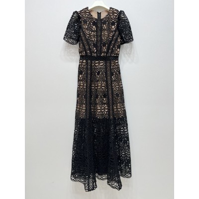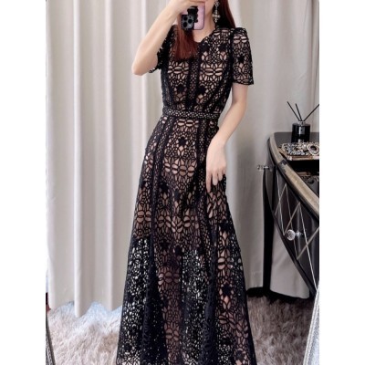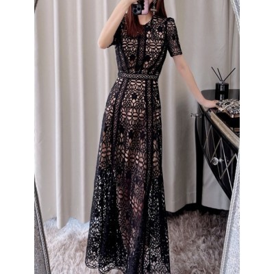 الرئيسية > يرتدي > Extrañar > 2022 FallWinter New Round Neck Black Faux Hand Crochet Lace Floral Embroidery High Waist Women Casu(